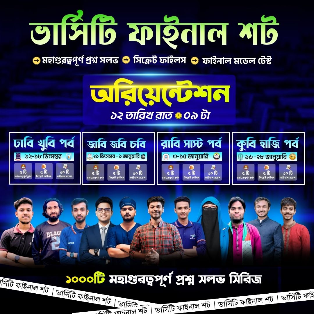 মহাগুরত্বপূর্ণ চারটি ক্লাসে জবি জাবি চবি ভর্তি পরীক্ষার কমনউপযোগী ৫০০ প্রশ্ন সলভ করানো হবে এবং ক্লাস শেষে সিক্রেট ফাইলস PDF দেয়া হবে, যেখানে আরো ৫০০টি প্রশ্ন থাকবে। চার দিনে চারটি ক্লাস ও সিক্রেট ফাইলস পড়ে পুরো সিলেবাসের উপর সেরা ফিনিশিং দিতে পারবে।