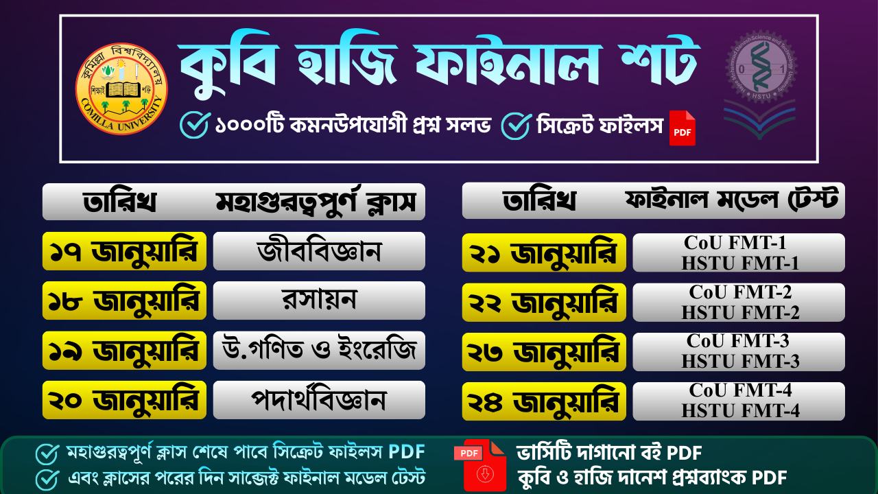মহাগুরত্বপূর্ণ চারটি ক্লাসে কুবি হাজি ভর্তি পরীক্ষার কমনউপযোগী ৫০০ প্রশ্ন সলভ করানো হবে এবং ক্লাস শেষে সিক্রেট ফাইলস PDF দেয়া হবে, যেখানে আরো ৫০০টি প্রশ্ন থাকবে। চার দিনে চারটি ক্লাস ও সিক্রেট ফাইলস পড়ে পুরো সিলেবাসের উপর সেরা ফিনিশিং দিতে পারবে।